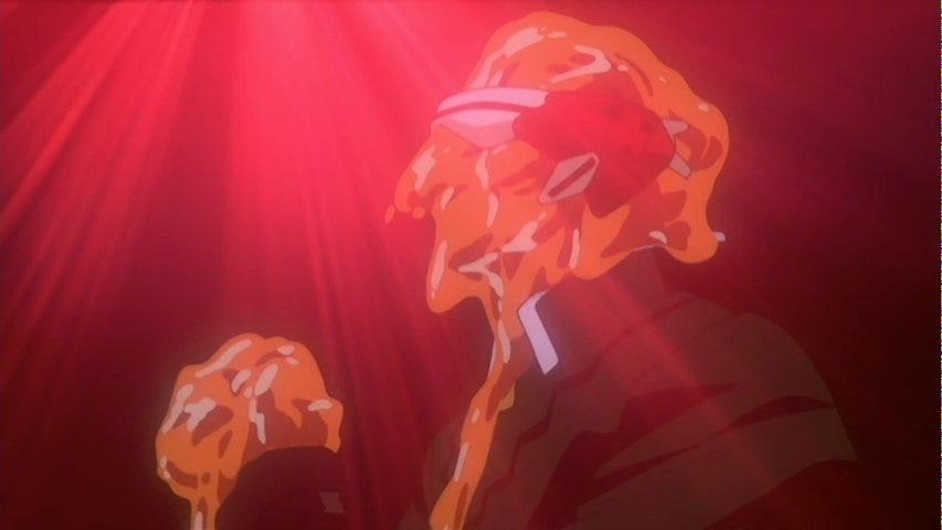 The baby wants to return to the nirvana of no desires, which union with the mother achieves for a time. The experience of union dissolves what’s there of the baby’s primitive self; hence the Lacanian concept of jouissance (specifically “the mother as jouissance”), it's an experience or feeling that will recycle you as a subject back into the primal unity of the world; it turns you into the orange goo from Neon Genesis Evangelion. It always comes from the mOther. That’s why it’s always transgressive and is defended against, the prohibition against it maintains you as a coherent subject.